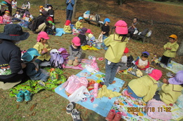 ヤギやウサギと触れ合ったり、木の実や色ずいた葉っぱを拾ったり、美味しいお弁当を食べたり、草スキーをしたり、おやつをたべたり…。