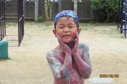 とお友達と見せ合って大喜びでした。絵の具の感触を「気持ちいい〜」と