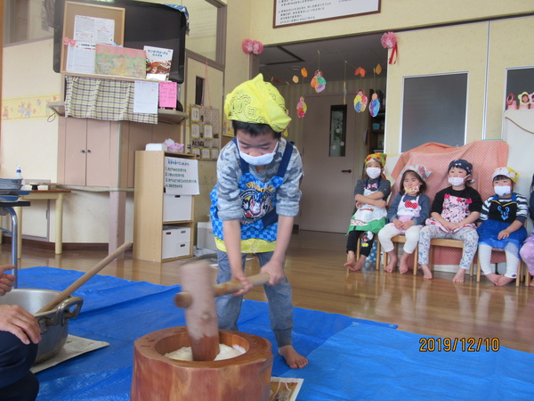 お正月を迎える準備です。みんなでもちつきを楽しみました。
