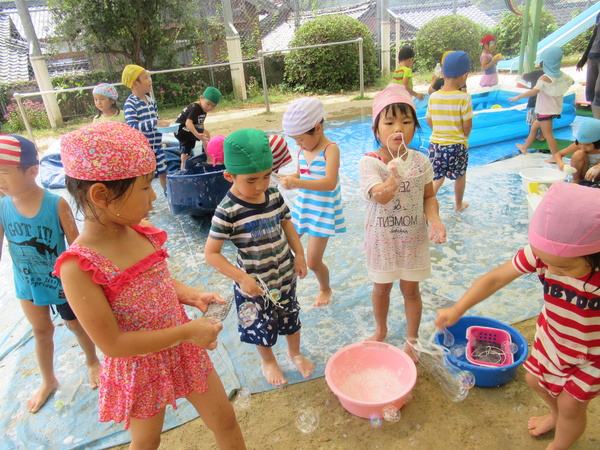 泡をブクブクさせたり、シャボン玉をつくったり、みずをかけあったり…。