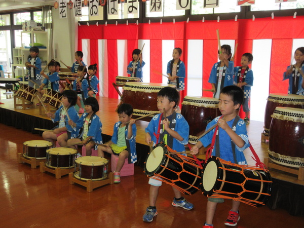 老健おばまの夏祭りで光・月組さんが和太鼓演奏をしてきました!5月から練習をしてきて、子ども達にとっては初ステージとなりましたが、元気にたたくことができていました。お客さんにたくさん拍手をしてもらい、子ども達もニコニコ嬉しそうでした♪季節の歌を歌ったり、おじいちゃん、おばあちゃんと触れ合い遊びをしたりと楽しい時間を過ごしました。最後にはかき氷をいただいて大満足の子ども達でした♪♪