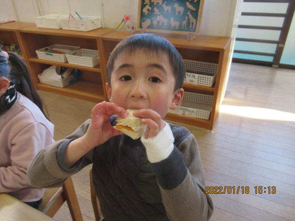 みんなでつくったフルーツサンドは特別美味しかったようで大きな口を開けて食べていました♪